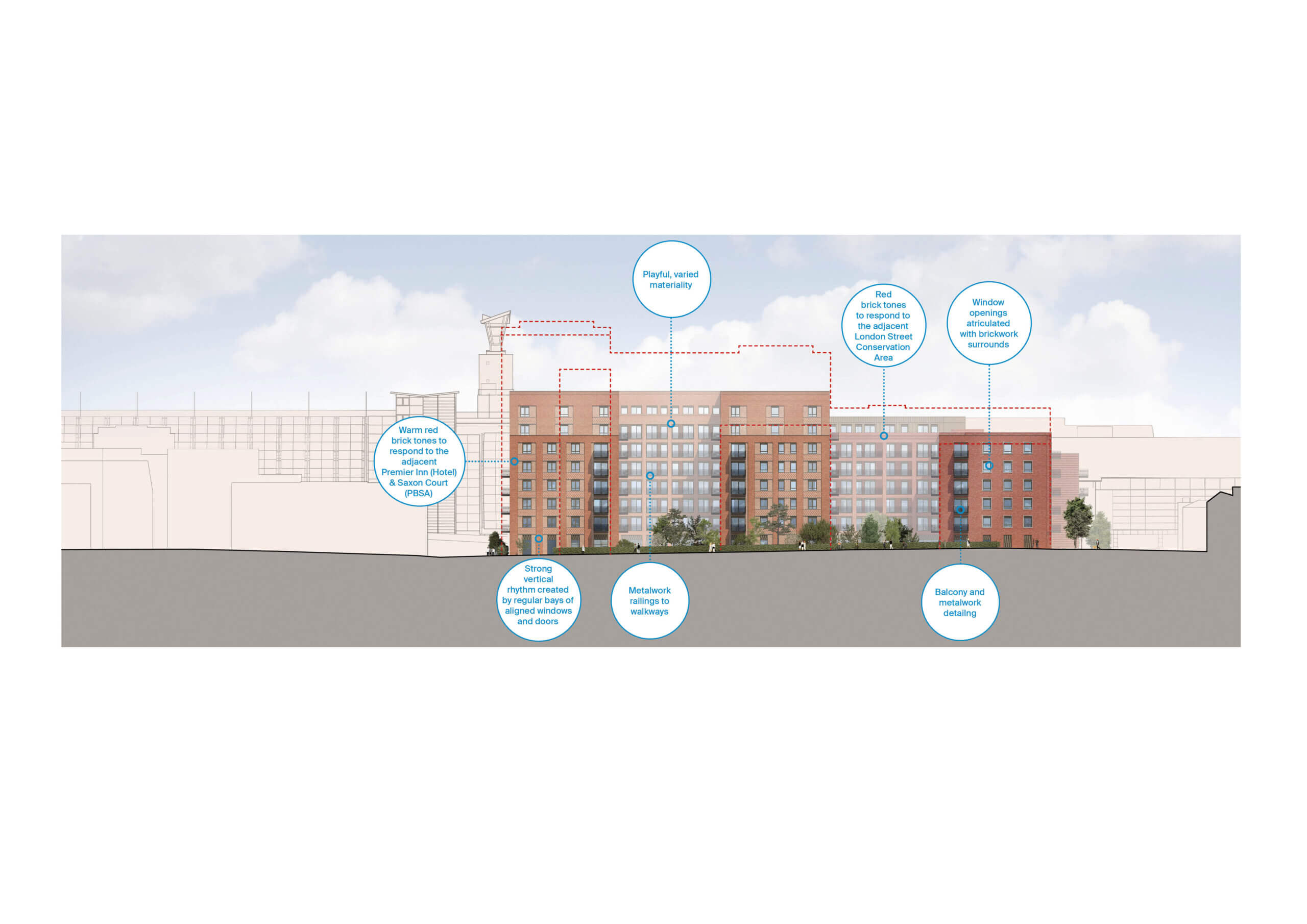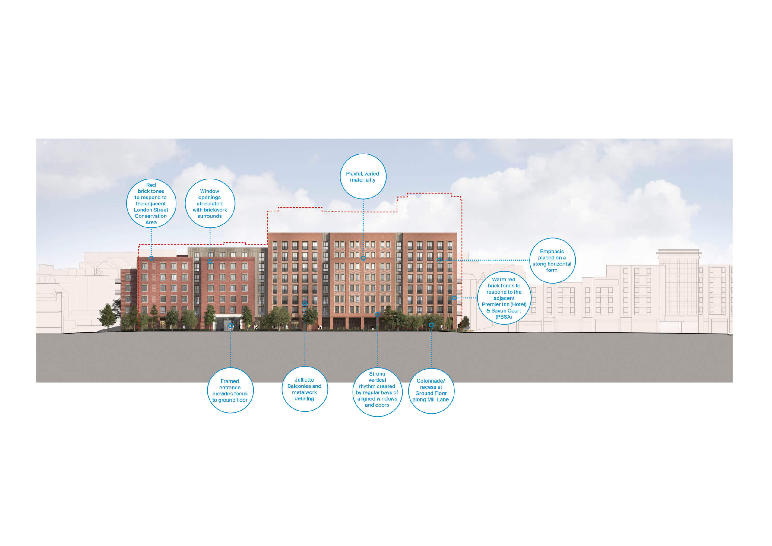Architecture | Predominantly brick with horizontal banding that echoed the Market Place & London Street Conservation Area | Refined massing, elevation design and material palette that reflects the immediate site context and conservation area |